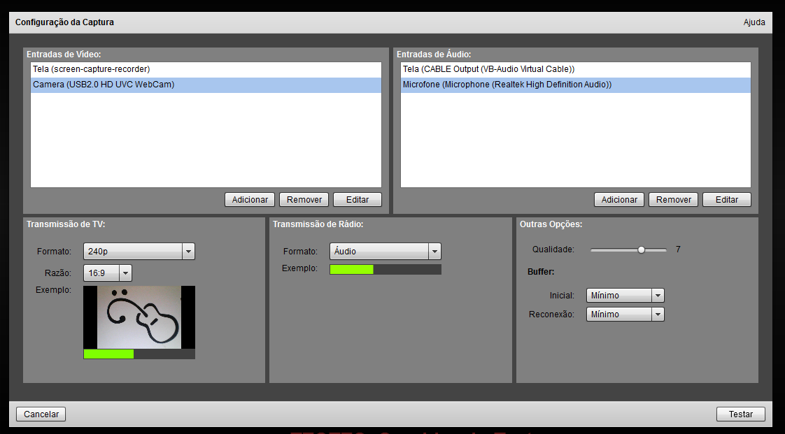 NOTA: A qualidade padrão para captura é a 5 sendo a qualidade 7 adequada a maioria dos computadores atuais. Altere conforme a disponibilidade de processamento do seu equipamento durante o teste.