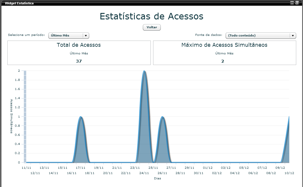 Neste widget apresentamos estatísticas recentes de acesso ao conteúdo da produtora. Aqui pode ser observado o total de acessos junto com o máximo de conexões simultâneas atingidas no período selecionado.