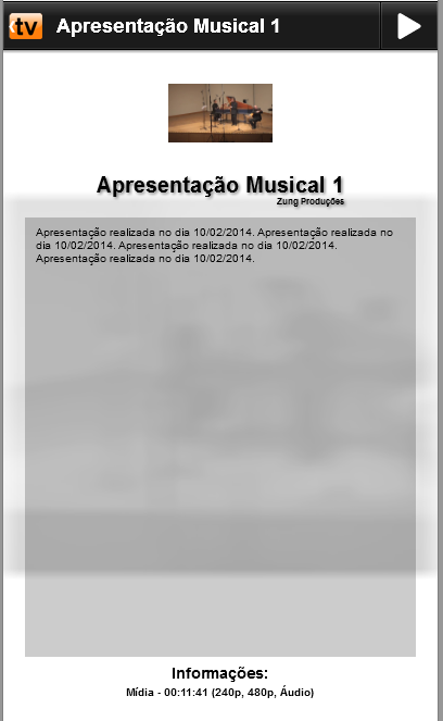 Tela de informações com texto cadastrado no módulo administrativo, formato disponível para as mídias e EPG para os canais.